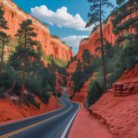 Scenic road through red sandstone cliffs in Zion National Park, Utah, USA