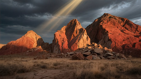 AI Generated. Red rocks in the desert surrounded by bright