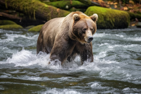 grizzly bear fishing for salmon in a roaring river, created with generative ai