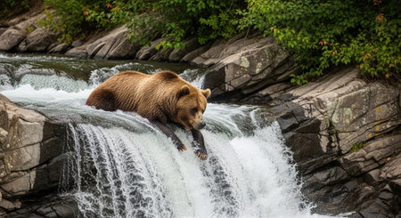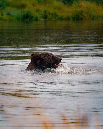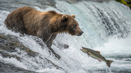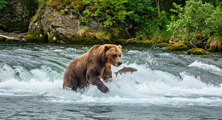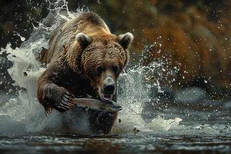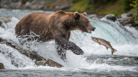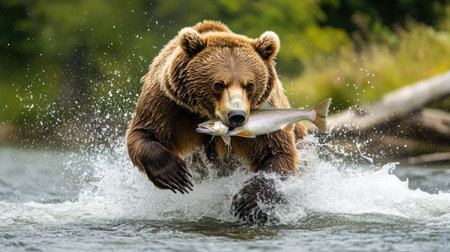 Bear catching salmon in river, leaping fish as bear feasts on fresh catch in natural habitat