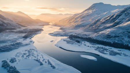 A serene river winds through snow-blanketed landscapes, surrounded by majestic mountains under a bright blue sky. The peaceful scene captures the beauty of winter.