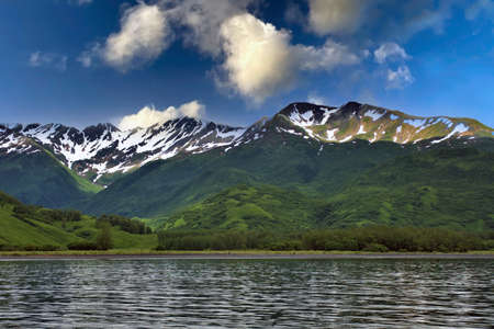 Alaska nature and mountain range with seascape in june