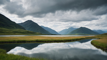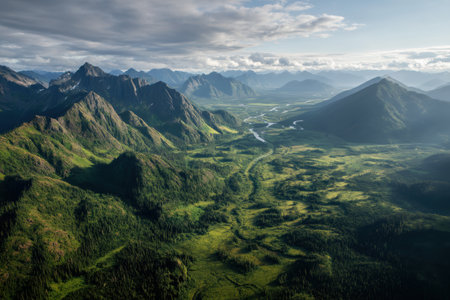 A breathtaking aerial perspective of a verdant valley outlined by majestic mountains and meandering rivers. soft morning light enhances the landscape's natural beauty, creating dramatic contrasts and shadows across the lush terrain.