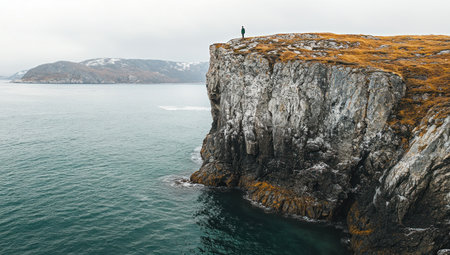 Photograph of an island in Norway, with some mountains and cliffs overlooking the sea. One person stands on top of the cliff, looking at the camera. Aerial view, panoramic shot, in the style of Unsplash photography. --ar 53:30 --v 6.1 Job ID: f0d1fbb4-8ab9-431c-903f-04862fc0b7b9