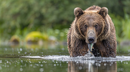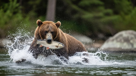 Action shot of brown bear emerging from a river with a fish in its mouth, splashes highlighting movement and strength