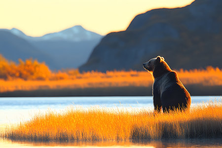 A grizzly bear stands on the edge of a tranquil lake, illuminated by the warm glow of a setting sun. surrounded by golden grasses, mountains and a serene sky, the scene essence of wilderness and tranquility. Generative AI