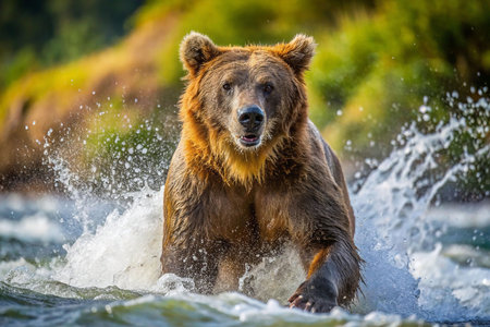 A brown bear is running through the water, splashing water everywhere