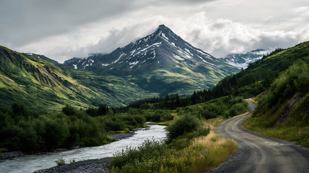 Captured in this image is an Alaskan landscape with a prominent snow-dusted mountain, a flowing river, lush green valleys, and a winding gravel road under a cloudy sky.