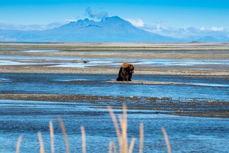 Alaskan Coastal Brown Bear grizzly searches for fish in a river in Katmai National Park, sitting on a sandbar