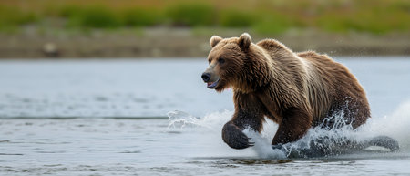 Grizzly bear chasing a salmon in Katmai National Park, Alaska