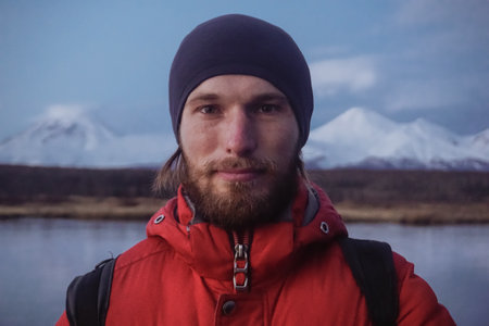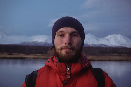 A Man with a View of Kamchatka Volcanoes at sunset