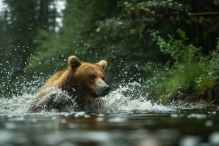 A bear expertly fishing in a river within a dense forest, with water splashing as it catches fish.. AI generated.