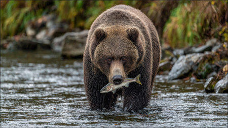 Massive brown bear stands in the shallow, moving water of a river, looking directly forward while holding a silver fish crosswise in its mouth, having recently secured its meal from the stream; the background shows blurred greenery and large stones along the bank, suggesting a remote, wild environment during the fish run.