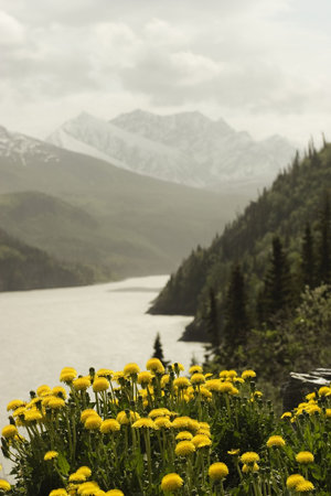 A few of Chugach mountains in Alaska with Copper River cutting through the range. Dandelions in the foreground. Focus on flowers