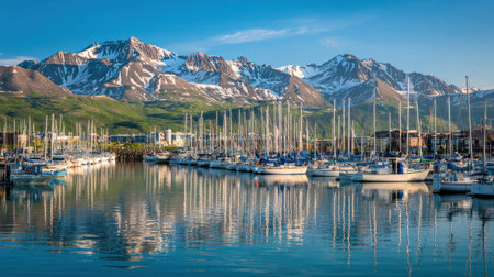 A breathtaking view of a serene marina filled with sailboats amidst majestic mountains and a clear blue sky, perfect for travel and exploration.