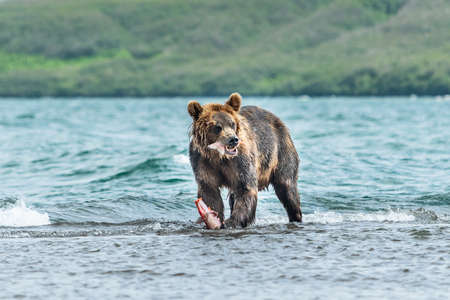 A brown bear in the water in Kamchatka, Russia
