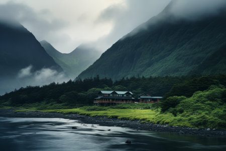 a bear gracefully swims in the shadow of trees, creating a captivating narrative-driven visual story. this national geographic photo, captured in 8k resolution, showcases an ambitious and zen-inspired scene. the dark gray and brown tones, along with the misty atmosphere, add depth and intrigue to this stunning wildlife image. ai generated