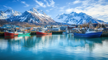 A tranquil coastal town features vibrant fishing boats gently resting in calm waters, framed by majestic snow-capped mountains under a clear blue sky.