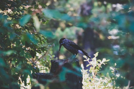 Tannhaeher bird (Nucifraga Caryocatactes) is sitting on a branch in the forest