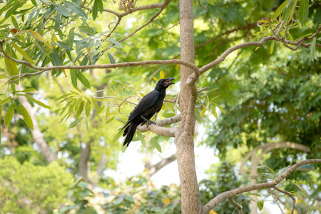 Image of asian koel bird (Eudynamys scolopaceus) male, on the branch on natural background.