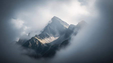 Explore a captivating mountain peak engulfed in dramatic clouds, showcasing stunning landscapes and the serene beauty of nature's untouched wilderness.