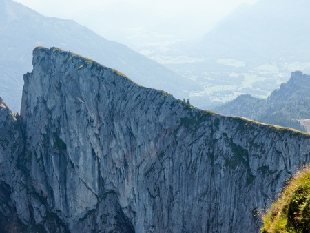 The limestone peaks in clouds over Gosau Valley in Dachstein massif, Austrian Alps, Europe