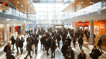 Vibrant exhibition center a dynamic trade fair with modern booths and engaged visitors