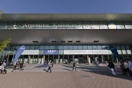 FRANKFURT, GERMANY - OCTOBER 8 2010: Visitors outside of the Argentine Guest of Honour Pavilion at the Frankfurt Book Fair. Argentina was the guest of Honour in 2010.