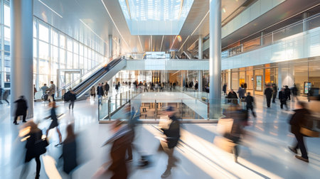 Modern mall office environment crowds of people going to work exposition groups of businesspeople in modern tech park business advancements meeting sun shining through huge windows architectural park