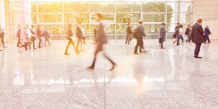 Blurry silhouettes of people walking in a business fair. Minimal business, work and selling concept. Copy space.