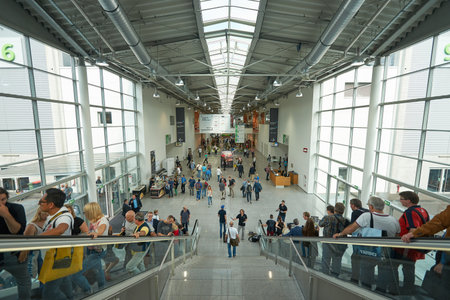 COLOGNE, GERMANY - SEPTEMBER 19, 2014: inside of Cologne Exhibition Centre during Photokina exhibition. The Photokina is the world's largest trade fair for the photographic and imaging industries