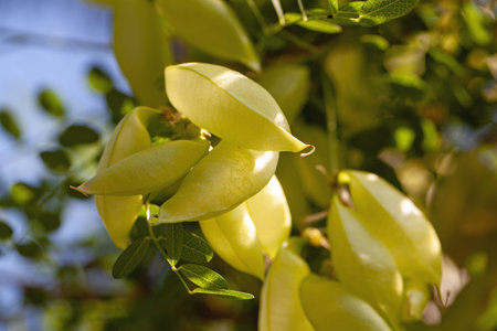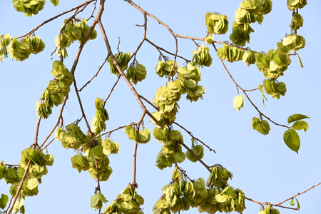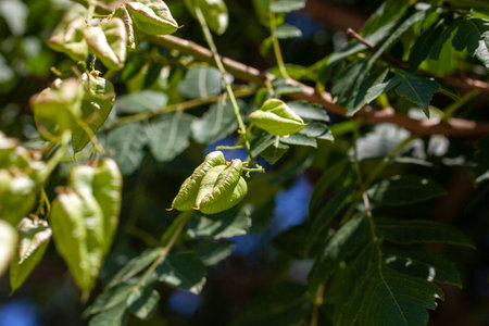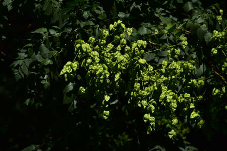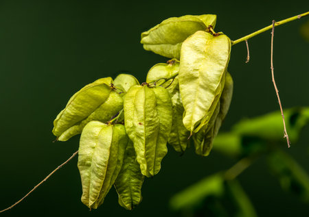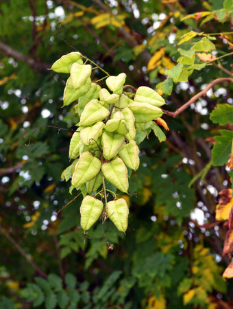 Branch with green fruits of Koelreuteria paniculata. The Koelreuteria fruit is a three-part inflated bladderlike pod yellow flower