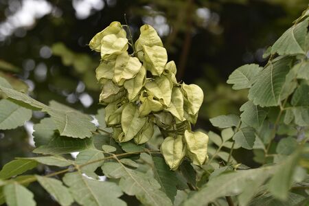 Legumens and foliage of a goldenrain tree, Koelreuteria paniculata