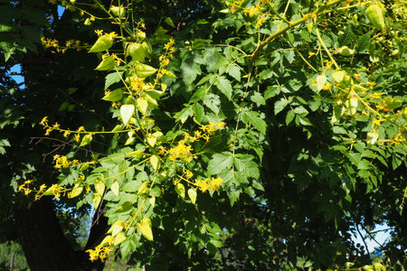 Koelreuteria paniculata is a species of flowering plant in the family Sapindaceae. A tree blooming with yellow flowers. Goldenrain tree, pride of India, China tree and the varnish tree.