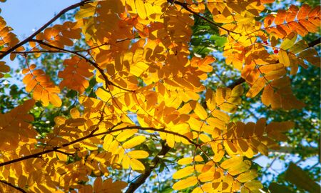 red yellow and orange leaf tree background. Natural background with leaves and bright sunlight.