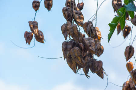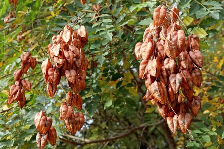 Koelreuteria paniculata seeds close-up of brown seeds and green leaves. Golden shower, pride of India, Chinese tree and lacquer tree.