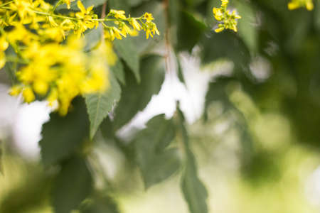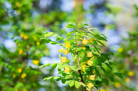 Unfocused, natural background with bokeh and blossoming yellow locust in the forest. selective focus