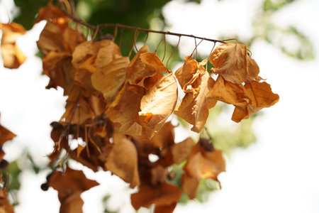 Tree branches display a mix of lively green leaves and clusters of dry, orange foliage, showcasing a transition in nature typical of late summer in a garden setting.