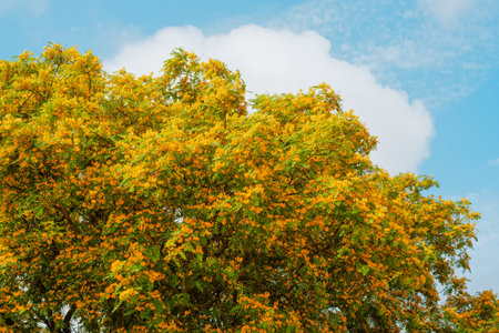 A tree with yellow leaves and a blue sky in the background. The leaves are full and the branches are full of fruit