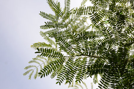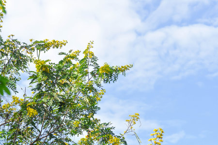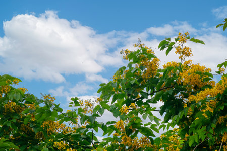 Photo of Copper pod flower ( Yellow flame, Yellow poinciana or Peltophorum pterocarpum (DC.) K.Heyne ) and green leaves under the blue sky in the park, Close up