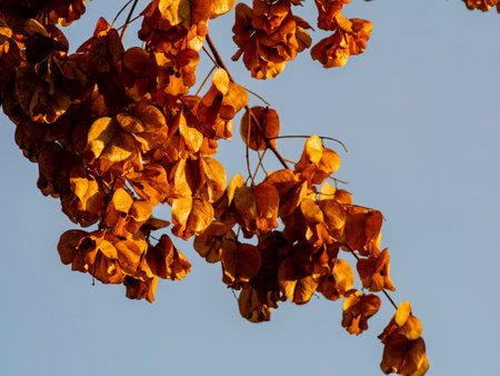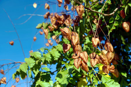 Close up of dried Staphylea, called bladdernuts on a tree in autumn, selective focus
