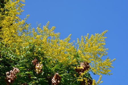 Golden rain tree branches with yellow flowers against blue sky. Koelreuteria paniculata