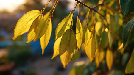A vibrant scene shows clusters of golden husks draping from green leaves against a clear blue sky, capturing the beauty of autumnal change in nature.