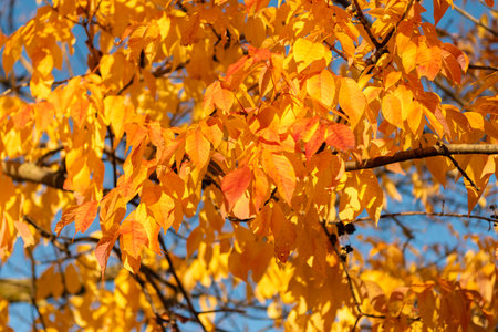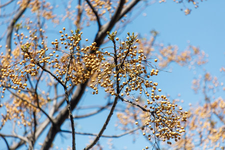 Branches of a chinaberry tree (Melia azedarach) with clusters of yellow autumn fruits (berries) and bright green leaves against a clear blue sky