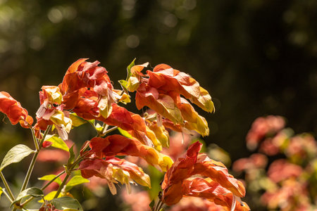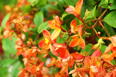 A group of red and orange Shrimp plant flowers with with green buds is on a green background of leaves and grass in a park in summer