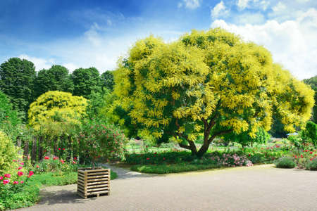 Lush crown of blooming yellow acacia. Tropical park on the shores of Tiberias lake. Israel
