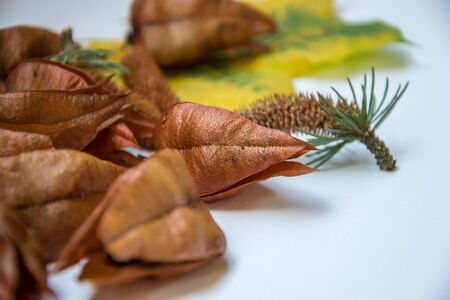 Beautiful brown tree pods and pine cones on white background, autumn decoration