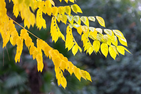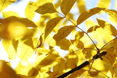 Natural background with tree branches and bright-yellow leaves on blurred background