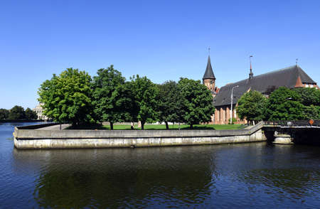 Kaliningrad, Russia - june 26, 2021: View on Kant Island and Cathedral against blue sky