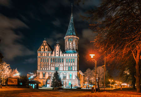 Night view of the Cathedral of Koenigsberg on the Kneiphof island, Kaliningrad. Konigsberg Cathedral is a Brick Gothic-style monument.